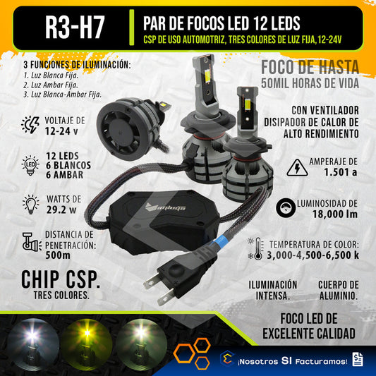 2 Focos Led H7 Ventilador Alta Baja Tricolor 18,000lm 12-24v H7