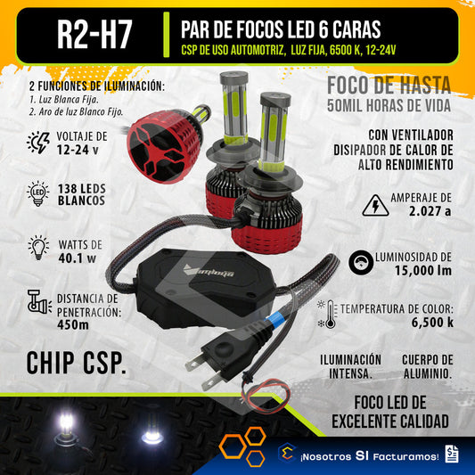 2 Focos Led H7 Ventilador Alta Baja Aro Luz 15,000lm 12-24v H7