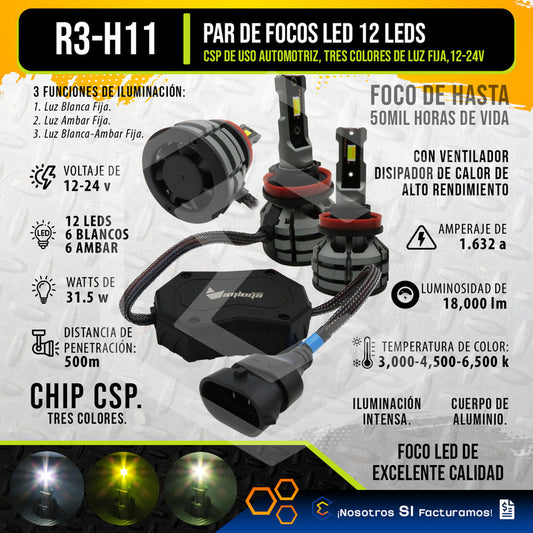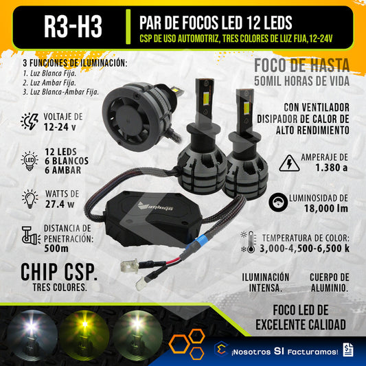 2 Focos Led H3 Ventilador Alta Baja Tricolor 18,000lm 12-24v H3