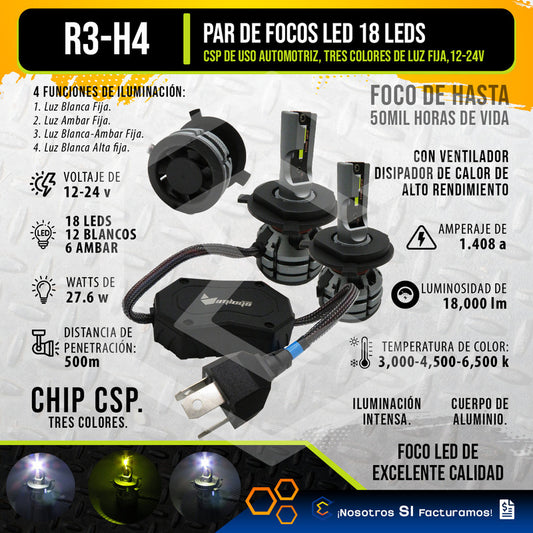 2 Focos Led H4 Ventilador Alta Y Baja Tricolor 18000lm 12-24 H4