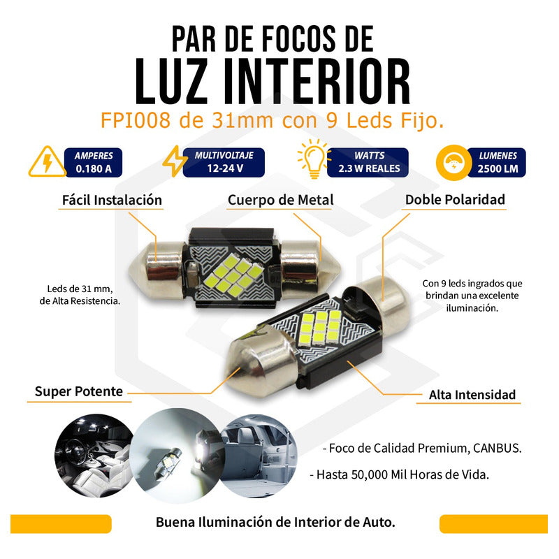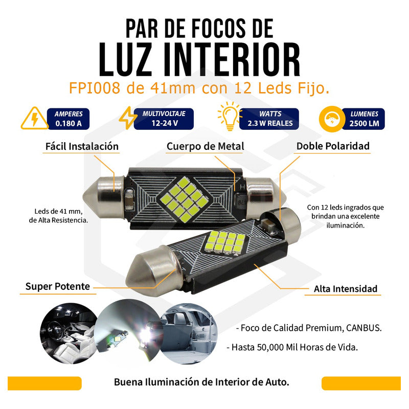 ¡Nosotros Si Facturamos, Esperamos Tu compra! !!ETAPI TRAE PARA TI! 10 Focos 12 Led Canbus C10w Festoon Fusible Interior 12/24v SKU: KITFPI008WH31MM KITFPI008WH36MM KITFPI008WH39MM KITFPI008WH41MM ***PRECIO POR 10 UNIDADES*** Este foco de interior de fácil instalación con doble polaridad, con leds canbus 12-24 v de resistencia y buena luminosidad tiene hasta 50, 000 horas de vida, con cuerpo de metal hacen de este foco uno excelente opción para instalarlo en interiores, porta placas, luces de espejo. Todos nuestros datos son 100% verídicos, Voltajes, Watts, Amperes. Puedes comprobarlo en la imagen de la publicación NO TE DEJES ENGAÑAR POR PUBLICACIONES CON INFORMACIÓN FALSA. Descripción: Foco con diseño compacto Brindan una excelente iluminación. Tecnología canbus, no marca error (foco fundido) Entrada Universal Tipo T10 /W5W/194/168 (Pellizco) -FÁCIL INSTALACIÓN -100% NUEVO CARACTERÍSTICAS: -Watts: 2.3 -Voltaje 12-24v -Amperes 0.180 -lúmenes 2500 -Leds 31 mm (9 leds) 36 mm (12 leds), 39 mm (12leds), 41 mm (12 leds) MEDIDAS DE FOCO: 12.3mm ancho x 31mm largo 12.3mm ancho x 36mm largo 12.3mm ancho x 39mm largo 12.3mm ancho x 41mm largo (Favor de elegir la medida correcta con la pieza original) (VER EN IMAGENES) Pueden colocarse en el interior y exterior del auto, por ejemplo, en tableros de instrumentos, luces de posición o cuartos, luz interior, porta placas, direccionales, entre otros, son muy comunes en todo tipo de vehículos y el más utilizado; Aunque estos iluminan mucho más fuerte porque tienen diodos de LED en lugar de los filamentos halógenos. La luz que proporciona es potente y Llamativa, más que suficiente para desempeñar su función. Colocarlos es de lo más sencillo, solo entran y salen con un poquito de presión. Foco totalmente universal, ideal para vehículos todo terreno, 4×4 ATV, UTV. ZRZ, Cuatrimotos, Jeep, Motocicletas; camiones de carga, remolques, tractores, etc. ¿Por qué ETAPI es tu mejor opción? En ETAPI tenemos más de 10 años de experiencia en Ventas de accesorios automotrices y pioneros con más de 7 años con ventas en Mercado Libre. Somos Mercado Líder Platinum, por la excelente calidad en productos, servicio y rapidez, prometiendo clientes satisfechos Te brindamos la mejor experiencia de compras por internet y te ofrecemos Asesoría de nuestros expertos desde el primer momento de tu compra, dando seguimiento hasta que el producto llegue a la puerta de tu casa. Tu compra esta 100% segura con nosotros. ¿Cuándo se realiza tu envió? Tu envió va con Mercado Envíos por DHL, ESTAFETA o FEDEX. El envío se realiza el mismo día de la compra o al siguiente día hábil, según la hora en que se realiza la compra. ¡Esperamos tu compra!