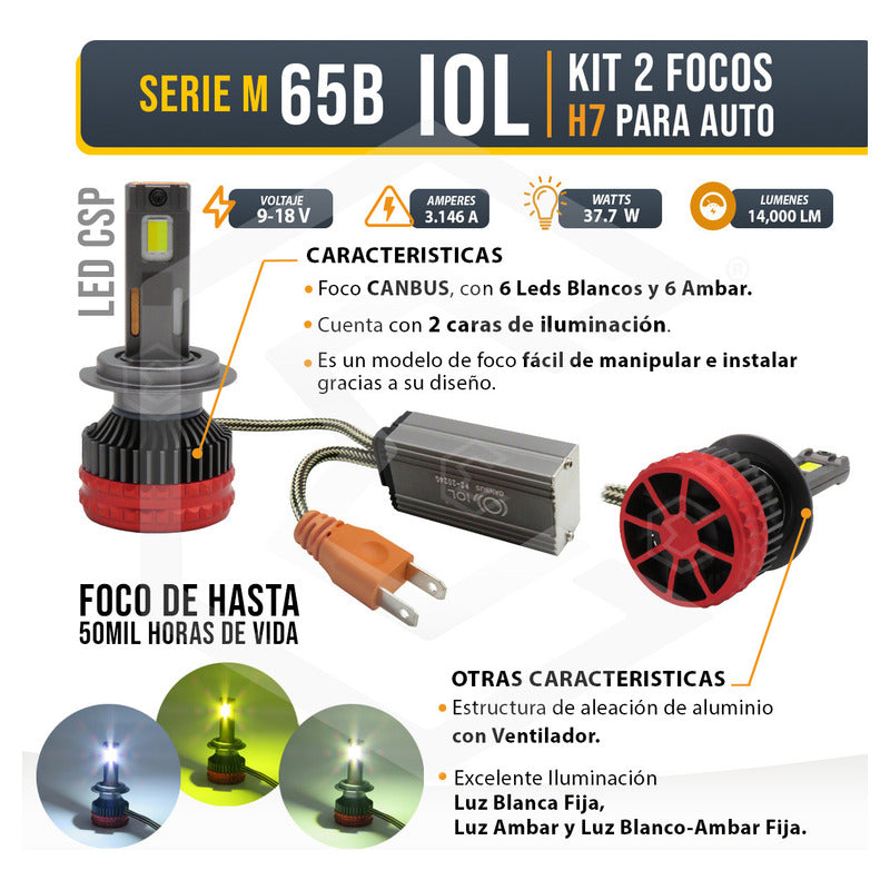 ¡Nosotros Si Facturamos, Esperamos Tu compra! ¡COMERCIALIZADORA ETARI TRAE PARA TI! PRECIO PUBLICADO POR UN KIT DE FOCOS SERIES M65B CON ENTRADA H7 SKU: IOL-LHL-266 Una de las principales ventajas que recibirás al comprar nuestros FOCOS AUTOMOTRIZ, es que te van a proporcionar una mejor visibilidad en la carretera. Las luces LED emiten una luz más blanca y brillante que las bombillas halógenas, lo que mejora la visibilidad nocturna y reduce el deslumbramiento para otros conductores. Esto puede resultar especialmente útil en carreteras de montaña o en zonas con poca luz. Con una vida útil de hasta 50.000 horas, más de 10 veces que las luces comunes de halógeno, ya que este FOCO AUTOMOTRIZ se hace de aleación de aluminio, duradera y disipador de calor, prolongando eficazmente la vida útil. Este FOCO es ideal para quien conduce habitualmente por carreteras con escasa iluminación, no deslumbra y su distancia de iluminación es limpia y clara. Todos nuestros datos son 100% verídicos, Voltajes, Watts, Amperes. Puedes comprobarlo en la imagen de la publicación. NO TE DEJES ENGAÑAR POR PUBLICACIONES CON INFORMACIÓN FALSA. Características: -Con Ventilador -HID LED H7 -Luz alta o baja -Voltaje: 9-18v -Amperaje: 3.146a -Watts: 37.7w -Lúmenes: 14,000lm -Leds: 6 leds blancos y 6 ambar -Temperatura de color: 6000k MEDIDAS (VER EN IMAGENES): 7cm alto x 3.3cm ancho ¿Por qué COMERCIALIZADORA ETARI es tu mejor opción? En COMERCIALIZADORA ETARI tenemos más de 12 años de experiencia en Ventas de accesorios automotrices y pioneros con más de 9 años con ventas en Mercado Libre. Somos Mercado Líder Platinum, por la excelente calidad en productos, servicio y rapidez, prometiendo clientes satisfechos. Te brindamos la mejor experiencia de compras por Internet y te ofrecemos Asesoría de nuestros expertos desde el primer momento de tu compra, dando seguimiento hasta que el producto llegue a la puerta de tu casa. Tu compra esta 100% segura con nosotros. ¿Cuándo se realiza tu envió? Tu envió va con Mercado Envíos. El envío se realiza el mismo día de la compra o al siguiente día hábil, según la hora en que se realiza la compra. ¡Esperamos tu compra