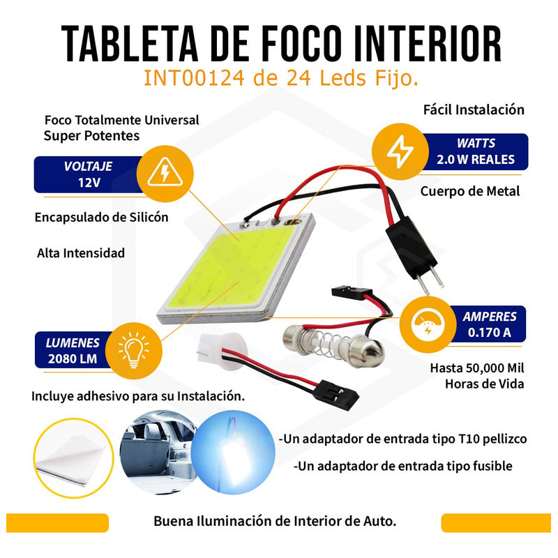 Nosotros Si Facturamos, Esperamos Tu compra ETAPI TRAE PARA TI Sku: INT001/24 INT001/48 (EL PRECIO PUBLICADO ES POR DOS UNIDADES) Esta placa de interior de fácil instalación tiene hasta 50, 000 horas de vida, con encapsulado de silicón, hacen de esta placa una excelente opción para instalarlo en interiores, porta placas, y foco de lectura. La luz que proporciona es potente y Llamativa, más que suficiente para desempeñar su función. Colocarlos es de lo más sencillo, solo entran y salen con un poquito de presión. Foco totalmente universal, ideal para vehículos todo terreno, 4×4 ATV, UTV. ZRZ, Cuatrimotos, Jeep, Motocicletas; camiones de carga, remolques, tractores, etc. Todos nuestros datos son 100% verídicos, Voltajes, Watts, Amperes. Puedes comprobarlo en la imagen de la publicación NO TE DEJES ENGAÑAR POR PUBLICACIONES CON INFORMACIÓN FALSA. Descripción: -Foco con diseño placa -Brinda EXCELENTE iluminación. -Con adaptadores de entrada tipo T10 pellizco y adaptador tipo Festoon Fusible compatible de 31mm a 41mm (31mm, 36mm, 39mm y 41mm) -Fácil instalación -100% nuevo -Temperatura de color: 6500k -La placa incluye adhesivo para su instalación. Características INT001/24: -Watts: 2w -Voltaje: 12v -Leds: 24 -Lúmenes: 2,081lm -Amperes: .170 Medidas (VER EN IMAGENES): 36.1mm alto x 26.4mm largo x 3.4mm ancho Características INT001/48: -Watts: 2w -Voltaje: 12v -Leds: 48 -Lúmenes: 2267 lm -Amperes: .170 Medidas (VER EN IMAGENES):40.1mm alto x 35.7mm largo x 3.4mm ancho INCLUYE: -Una placa interior -Un adaptador de entrada tipo T10 pellizco -Un adaptador de entrada tipo fusible compatible de 31mm a 41mm (31mm, 36mm, 39mm y 41mm) ¿Por qué ETAPI es tu mejor opción? En ETAPI tenemos más de 10 años de experiencia en Ventas de accesorios automotrices y pioneros con más de 7 años con ventas en Mercado Libre. Somos Mercado Líder Platinum, por la excelente calidad en productos, servicio y rapidez, prometiendo clientes satisfechos. Te brindamos la mejor experiencia de compras por Internet y te ofrecemos Asesoría de nuestros expertos desde el primer momento de tu compra, dando seguimiento hasta que el producto llegue a la puerta de tu casa. Tu compra esta 100% segura con nosotros. ¿Cuándo se realiza tu envió? Tu envió va con Mercado Envíos por DHL, ESTAFETA o FEDEX. El envío se realiza el mismo día de la compra o al siguiente día hábil, según la hora en que se realiza la compra. ¡Esperamos tu compra!